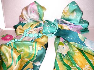 Цена на изделие состоит: из цены за материал ( ткань, краски, резервирующий состав) и цены за работу.Материал : ткань - натуральный шёлк( крепдешин, экцельсиор, атлас, шифон, туаль, фуляр) цены колеблются от 450 р. за метр до 2000 р.краски Гамма . Цены 50 - 150 р. за один колер.резерв: Pebeo (Франция). 400 р. Холодный батик - стеклянные трубочки (для резервирующего состава). - 30 р. штука.