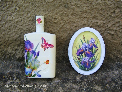 Я взяла лист рисовой бумаги и вырезала понравившиеся фрагменты. Затем наклеила их на уже покрашенную бутылку.